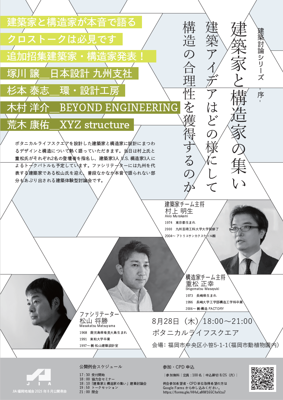<JIA福岡地域会8月公開例会> 建築討論シリーズ -序- 建築家と構造家の集い 建築アイデアはどの様にして構造の合理性を獲得するのか 建築家と構造家による建築体験型討論会を行いました。